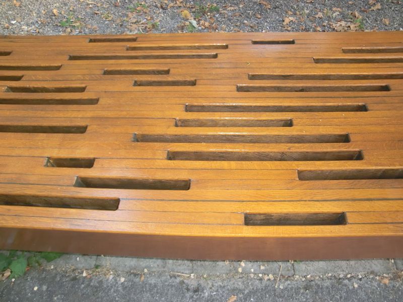 Die Bänke wurden von uns komplett überarbeitet. Vorhandene Farbe wurde abgelaugt, das Holz mit Entgrauer behandelt. Die vermoosten Zwischenfugen wurden gereinigt, die offenen Leimfugen verharzt. Anschließend wurden die Bänke abgeschliffen und neu lasiert.