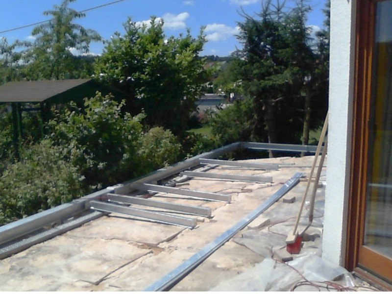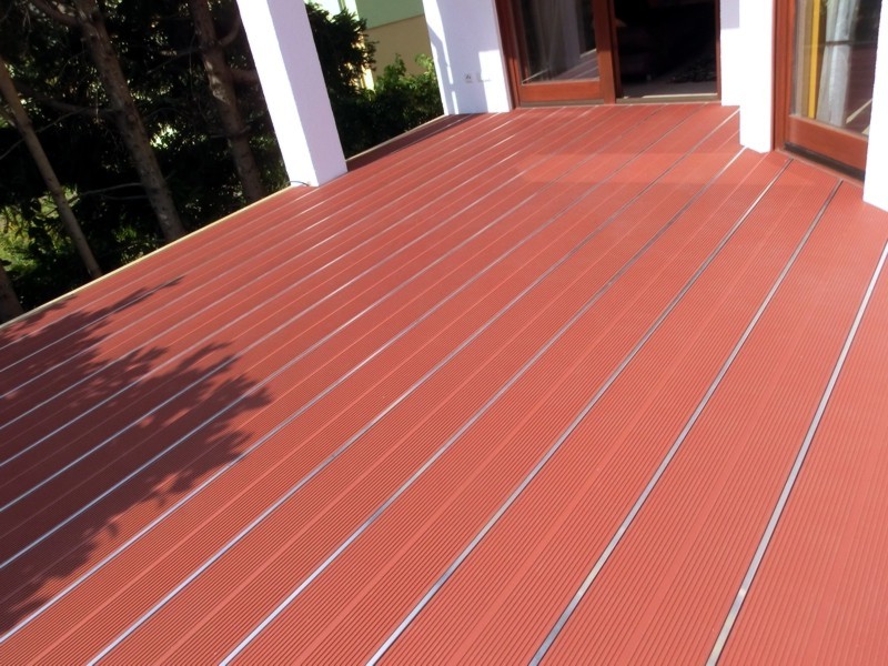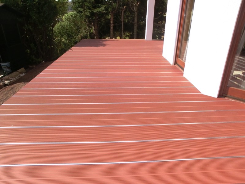 Die Unterkonstruktion aus Stahl, Aluminium und Holz gleicht die starken Höhenunterschiede aus. Der Terrassenbelag besteht aus Composit-Dielen in Rotbraun und Alphawing-Profilen.