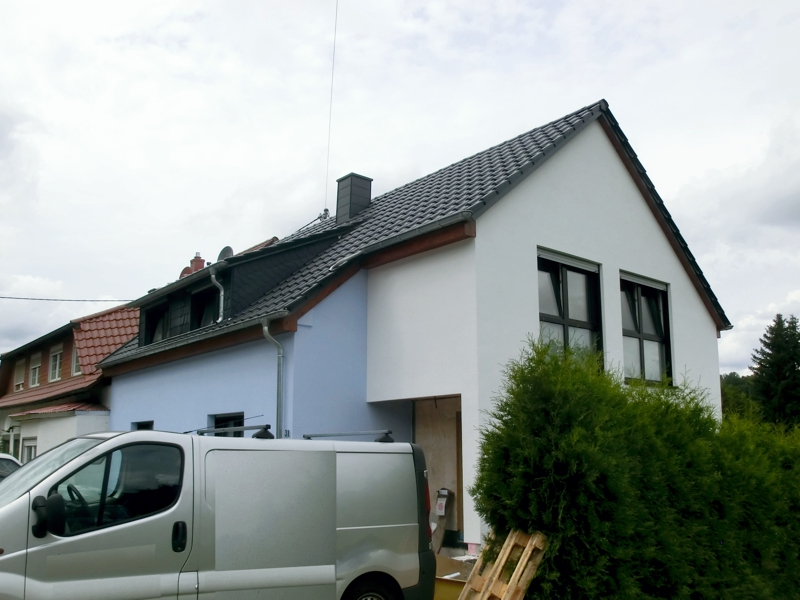 Unser Beitrag dazu waren die Steildachsanierung und das Flachdach mit sichtbarer Holzbalkendecke im aufgestockten Teil, außerdem der seitliche Anbau.