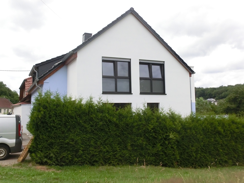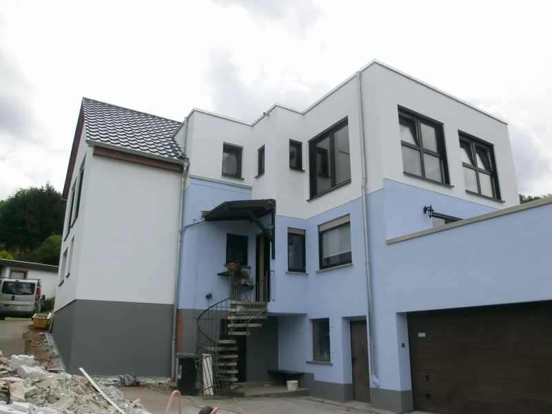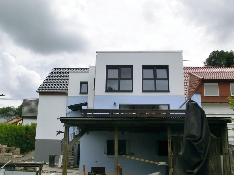 In diesem Fall wurde das Haus hinten aufgestockt und seitlich ein zusätzlicher Anbau erstellt, in dem u.a. auch das Treppenhaus seinen Platz gefunden hat.