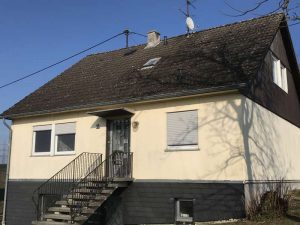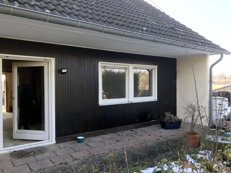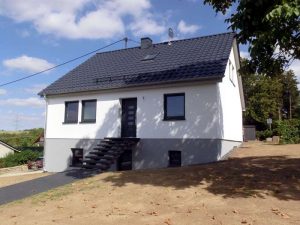 So wurde das Dach neu gedämmt und mit Tonziegeln eingedeckt. Die Trauf- und Giebelüberstände wurden mit Dreischichtplatten verkleidet. Die Wände wurden von außen saniert und neu verputzt, Fenster, Haustür und Rollläden wurden ausgetauscht. Der freistehende Kellerbereich wurde mit Perimeterdämmung gedämmt und verputzt. Im Terrassenbereich wurden Einbaustrahler eingebaut. Das undichte Garagendach wurde mit Sandwichelementen neu eingedeckt.