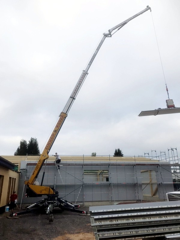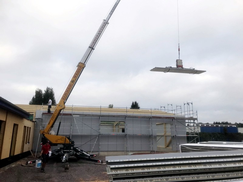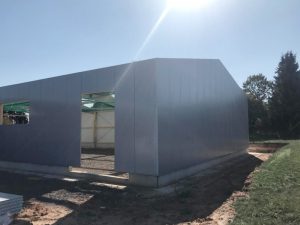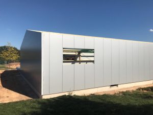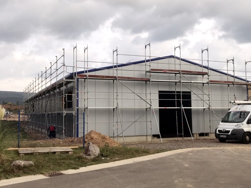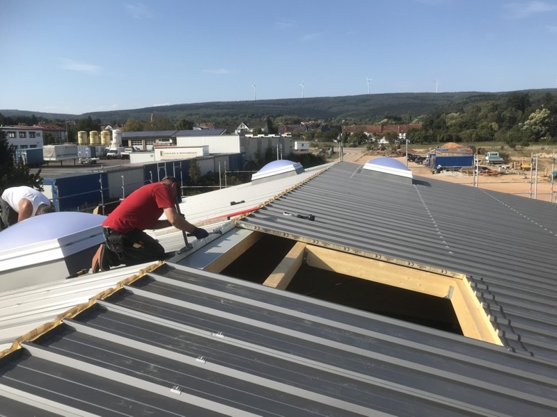 Auch wenn es schon wieder ein paar Tage her ist, hier eiinige Bilder vom Hallentrakt. Seitenwände und Dach sind fertig, die Lichtkuppeln eingebaut.