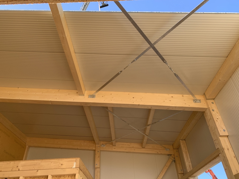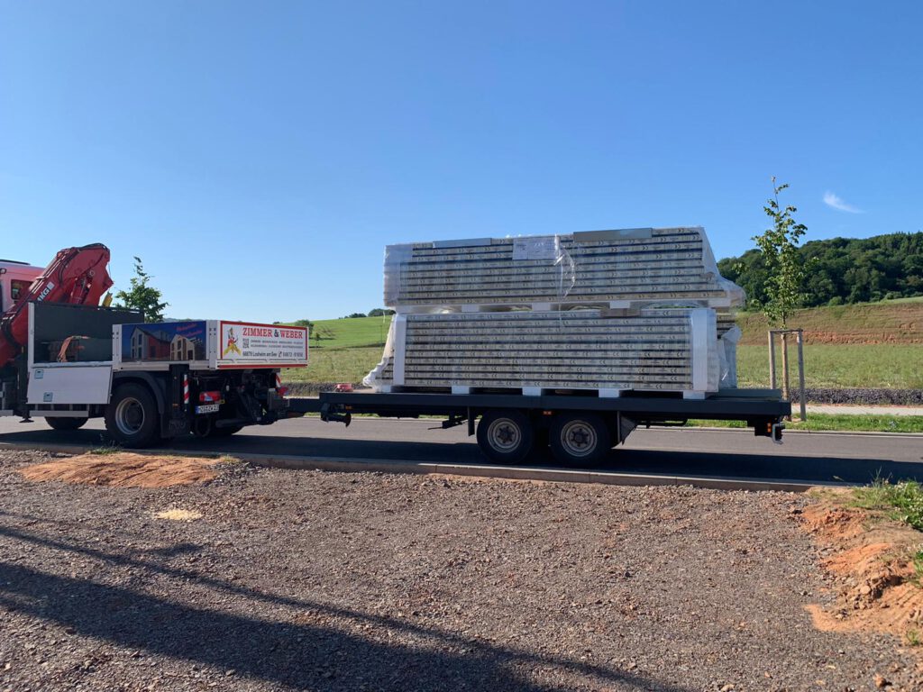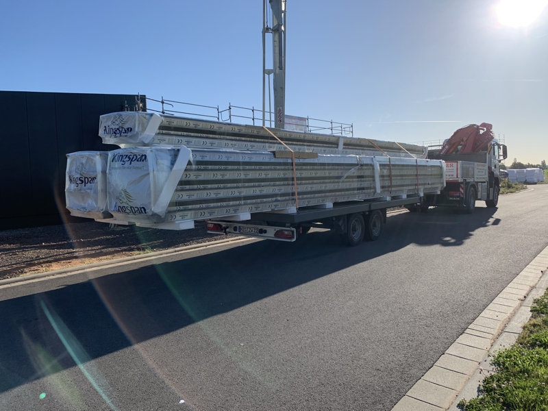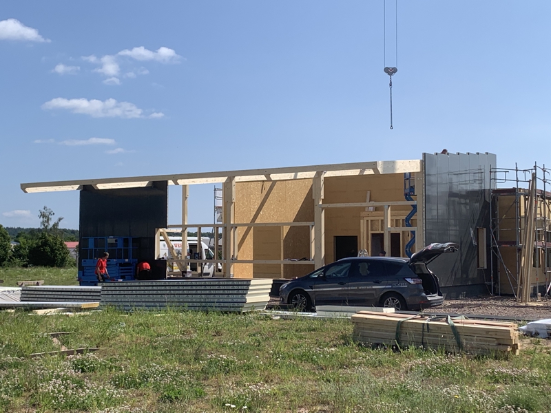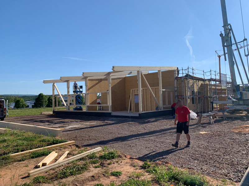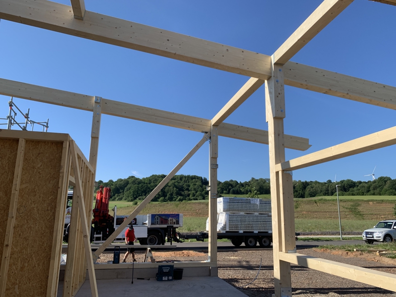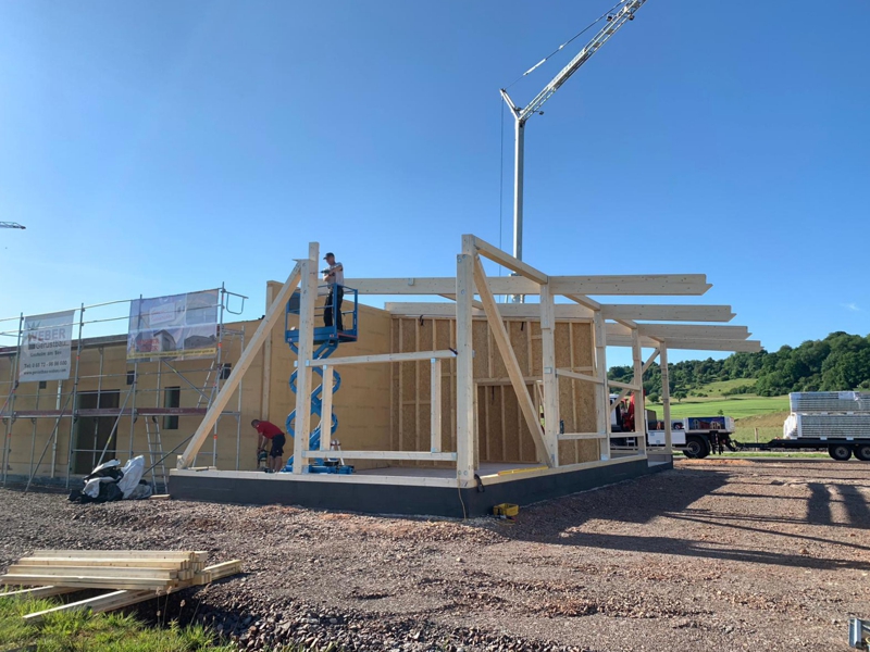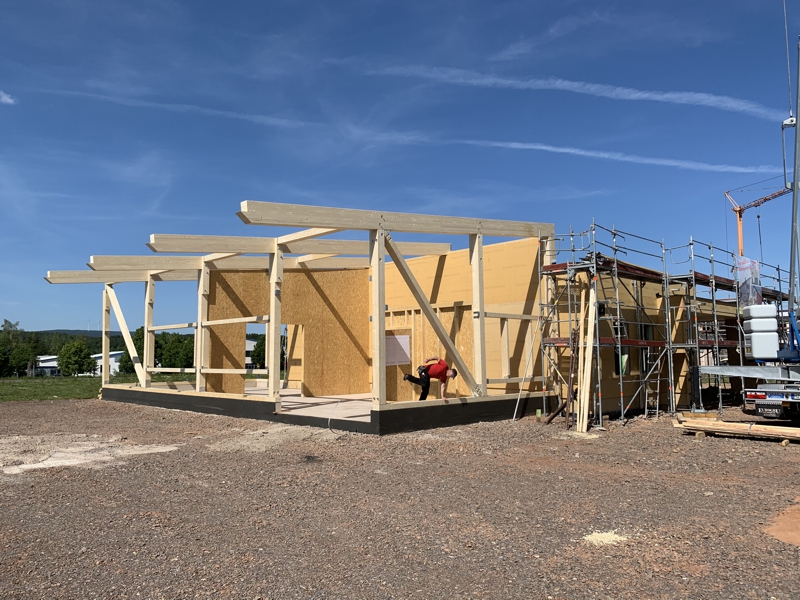 Der Aufbau der Konstruktion dauerte ca. 1,5 Tage, die Wand- und Deckenverkleidung ca. 3 Tage, wie man sieht, beides bei strahlendem Sonnenschein.