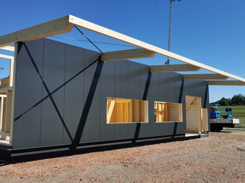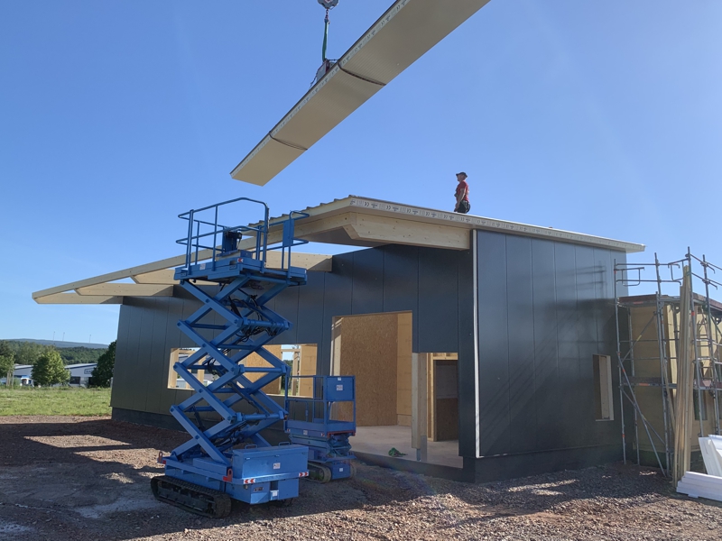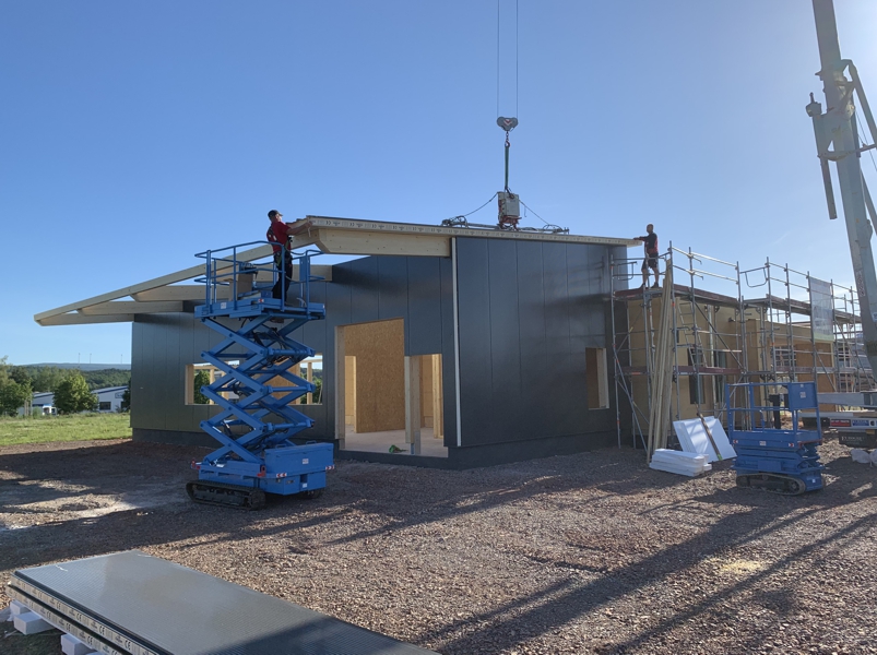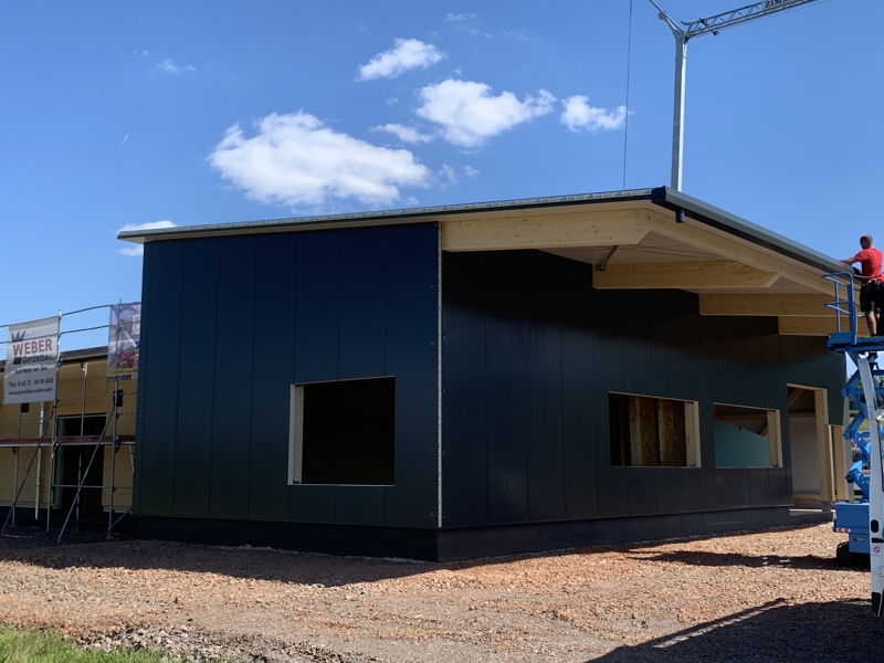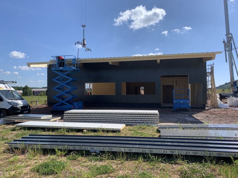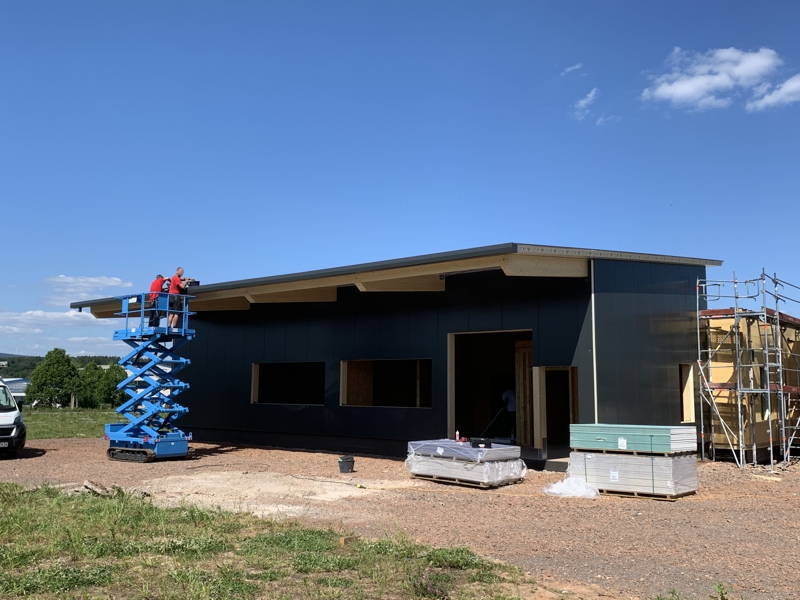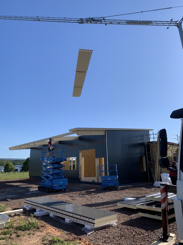 Inzwischen ist die Halle auch fertiggestellt. Es handelt sich um eine Produktions- und Lagerhalle mit einer Fläche von rund 100 qm. Die Wand- und Deckenverkleidung besteht aus Sandwichelementen.