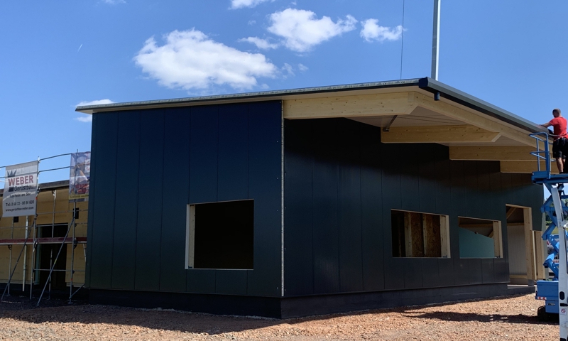 Inzwischen ist die Halle auch fertiggestellt. Es handelt sich um eine Produktions- und Lagerhalle mit einer Fläche von rund 100 qm. Die Wand- und Deckenverkleidung besteht aus Sandwichelementen.