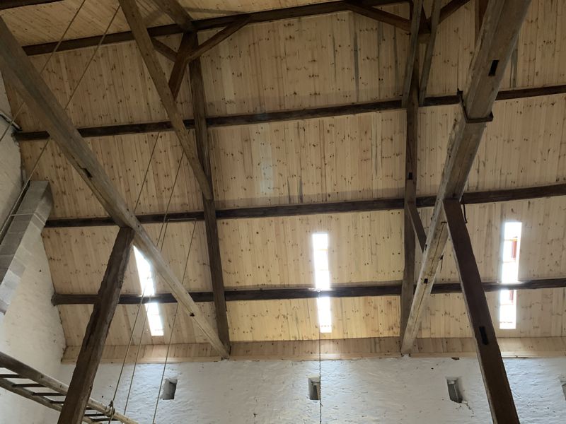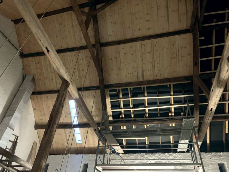 Bereits Anfang des Jahres wurde das Scheunendach von uns innen mit Nut- und Federbrettern verkleidet. Nun haben wir vom Bauherrn und Künstler freundlicherweise Bilder von den fertigen Räumen bekommen. Ein absolut gelungener Ausstellungsraum – herzlichen Dank für den Auftrag und die tollen Fotos!